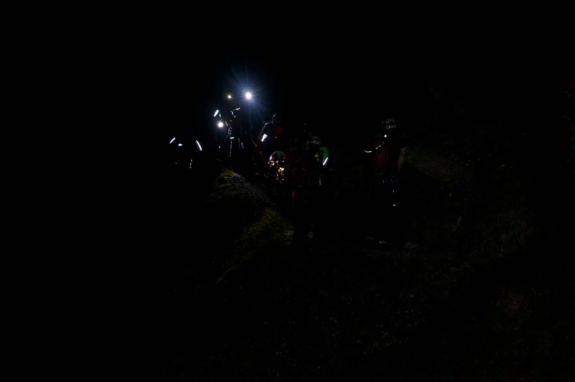 Wir bildeten 2 Teams, die unabhängig voneinander sich jeweils um einen Kletterer kümmerten. Für die Bergung des linken Verletzten richteten wir von ganz oben eine Abseilstelle ein. Wir haben ein Führungseil gespannt, an dem der Retter und der Bergesack mit dem Verletzten so von der Wand weggezogen werden konnte, dass die Bergung möglichst schohnend erfolgte. Der zweite Verletzte wurde mittels Schleifkorbtrage und einem Retter abgelassen.