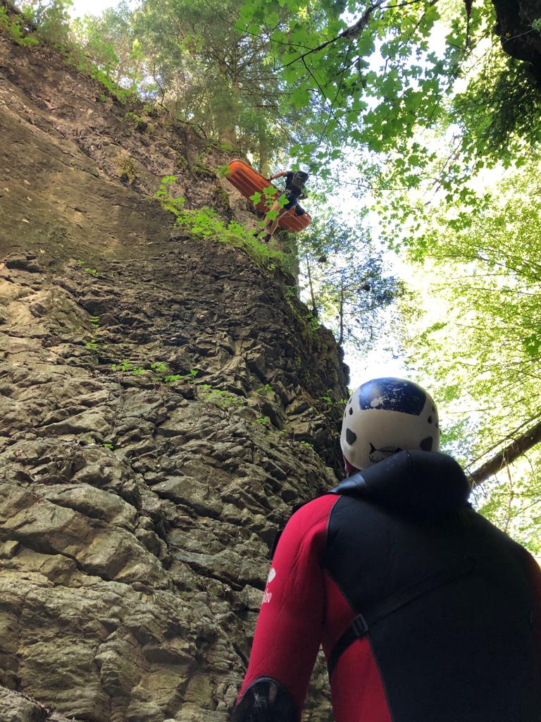 Am vergangenen Wochenende stand bei uns wieder die alljährliche Canyoningübung auf dem Programm. Übungsannahme war dass sich 2 Personen am oberen Einstieg direkt an der Osangbrücke verletzt haben. Nachdem Die Alarmierung raus ging machte sich der erste Trupp, bestehend aus 2 Canyoningrettern und 2 Bergrettern auf den Weg. Eine zweite Gruppe wurde zu einem anderen Einstieg geschickt da die Positionsangabe nicht eindeutig war. Die Verletzten konnten rasch gefunden werden und wurden erstversorgt. Auch unsere Anwärter durften mit runter in die Schlucht und freuten sich auf eine Abkühlung. In der Zwischenzeit traf die Landmannschaft Vorbereitungen zur Bergung. Diese erfolgte über ein Seilrollensystem an der die Trage befestigt war. Nach erfolgreich absolvierter Übung wurde im Heim das ganze Material gewaschen und für den nächsten Einsatz bereit gemacht.