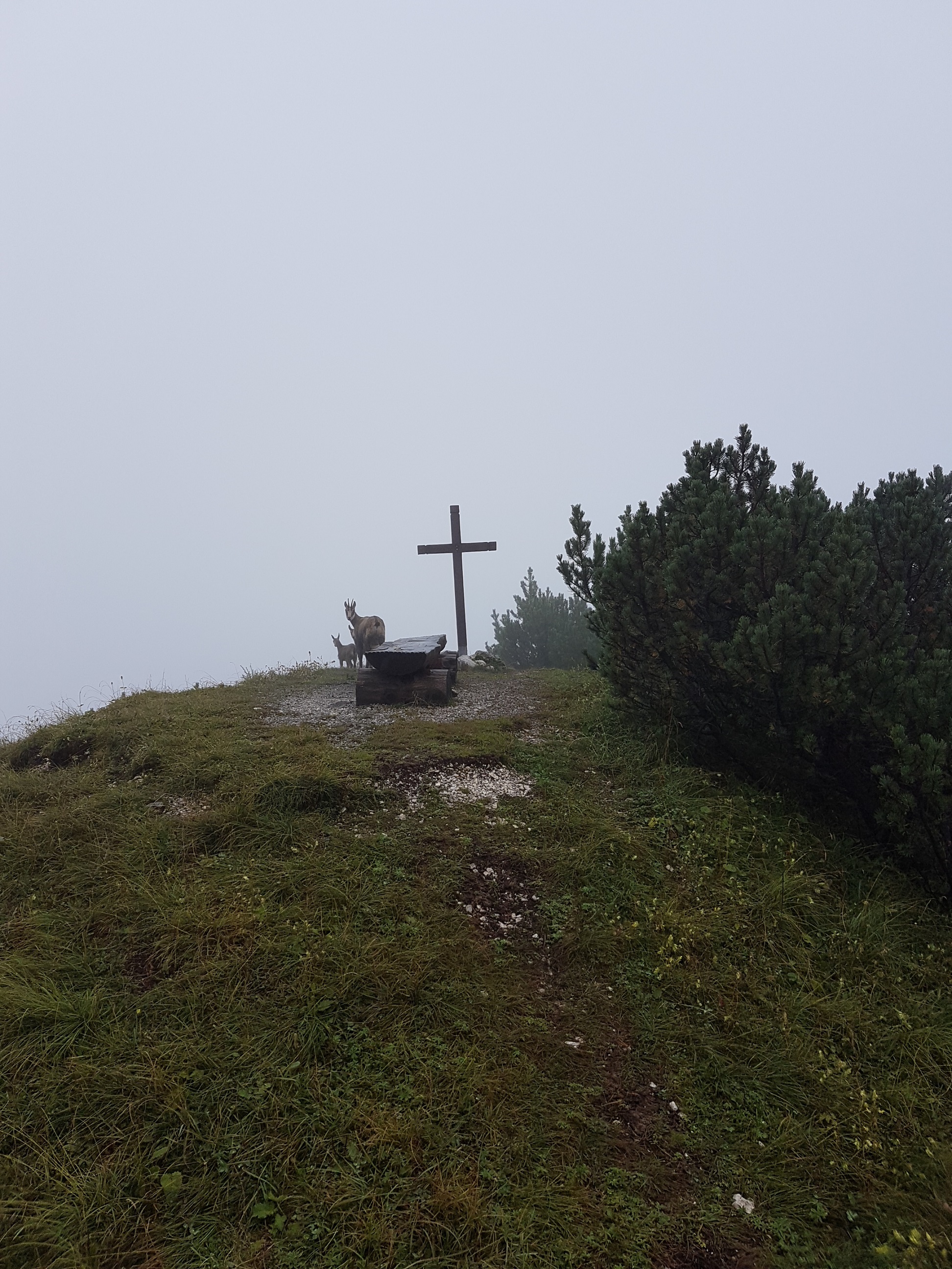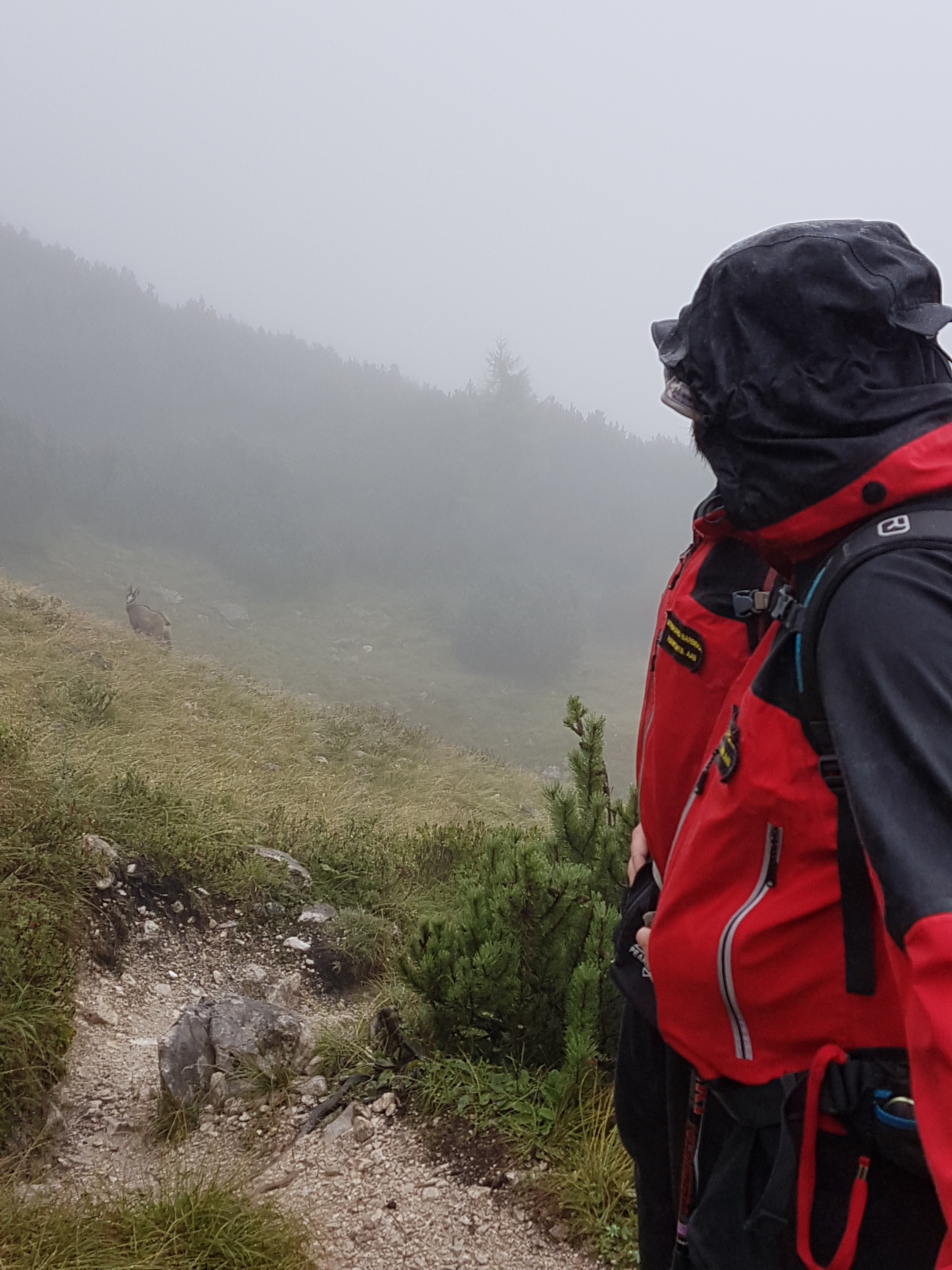 Am Samstagmorgen beschlossen wir trotz des miserablen Wetters nicht untätig zu sein und starteten unsere geplante Wanderung. Als Aufwärmrunde ging es über den Hubschrauberlandeplatz oberhalb der Hütte zum Hausberg Bloßkogel (1489m). Ganz alleine hatten wir den Gipfel nicht für uns, aber die zwei Gamsgeißen mit ihren Kitzen störten uns nicht und wir sie auch nicht. Solange man keinen Hut auf hat und grüne Kleidung trägt, wird man in diesem Gebiet nicht als Feind gesehen und eine friedliche 5m Koexistenz ist ganz normal. (Foto 3).