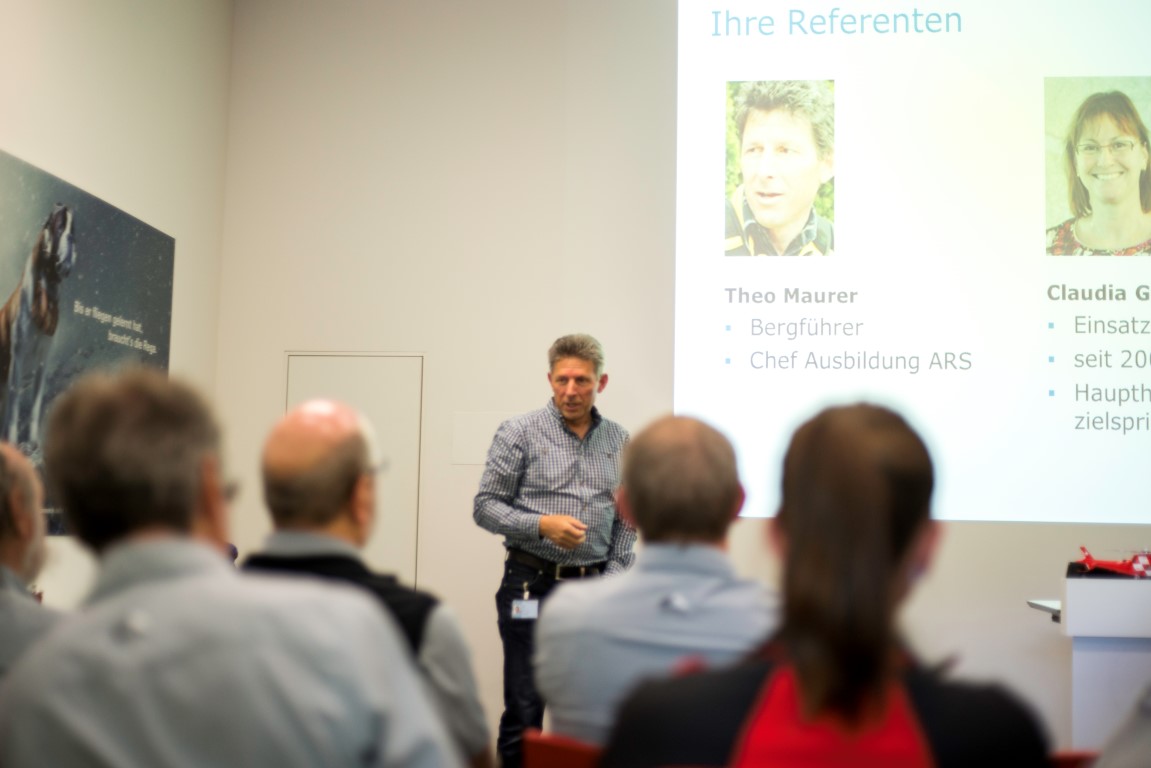 Theo MAURER berichtete über die Organisation der „Alpine Rettung Schweiz“ (ARS), ihre Ausbildung sowie über spektakuläre Rettungsaktionen im Gebirge und die gute Zusammenarbeit mit der REGA.