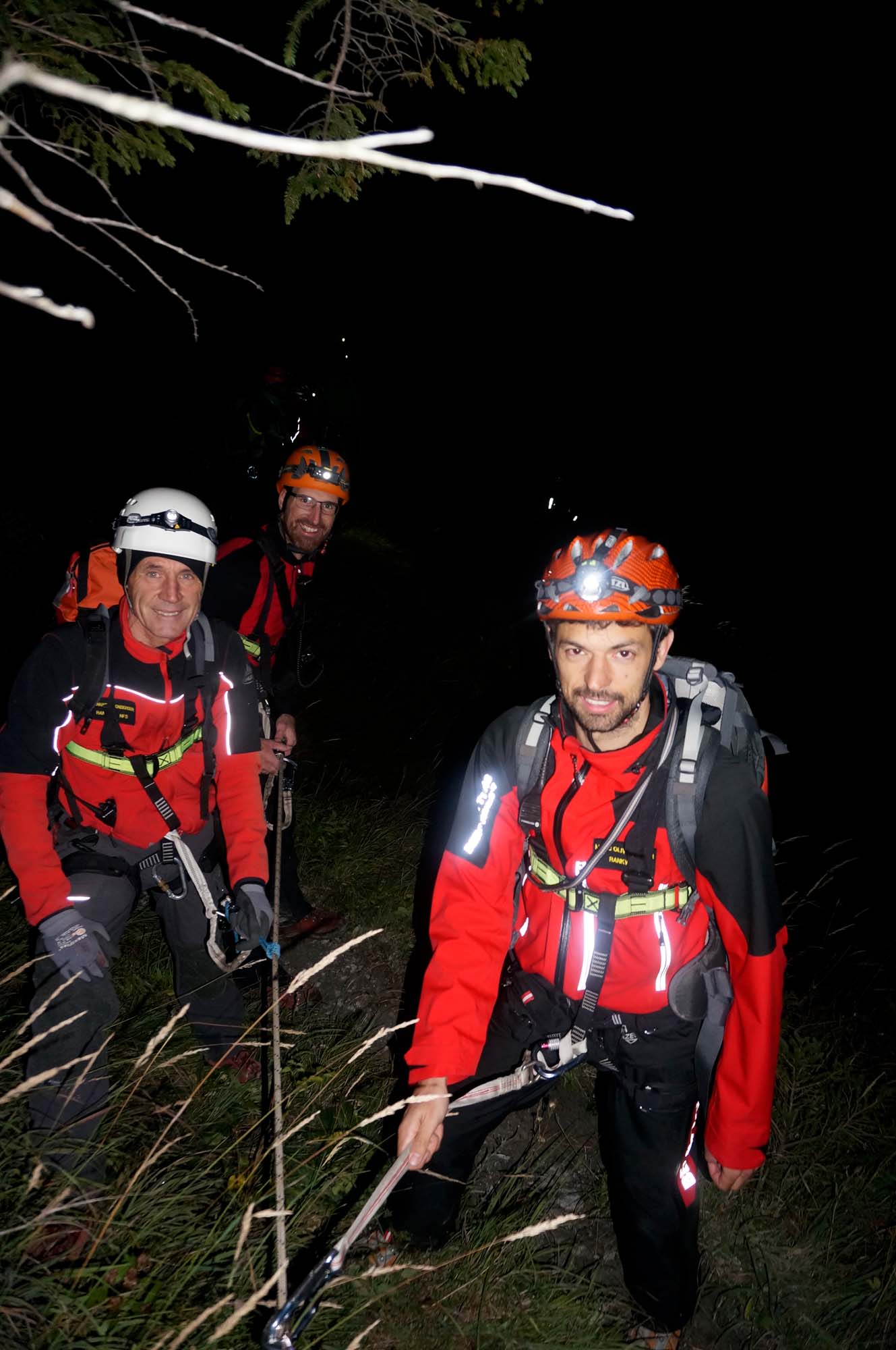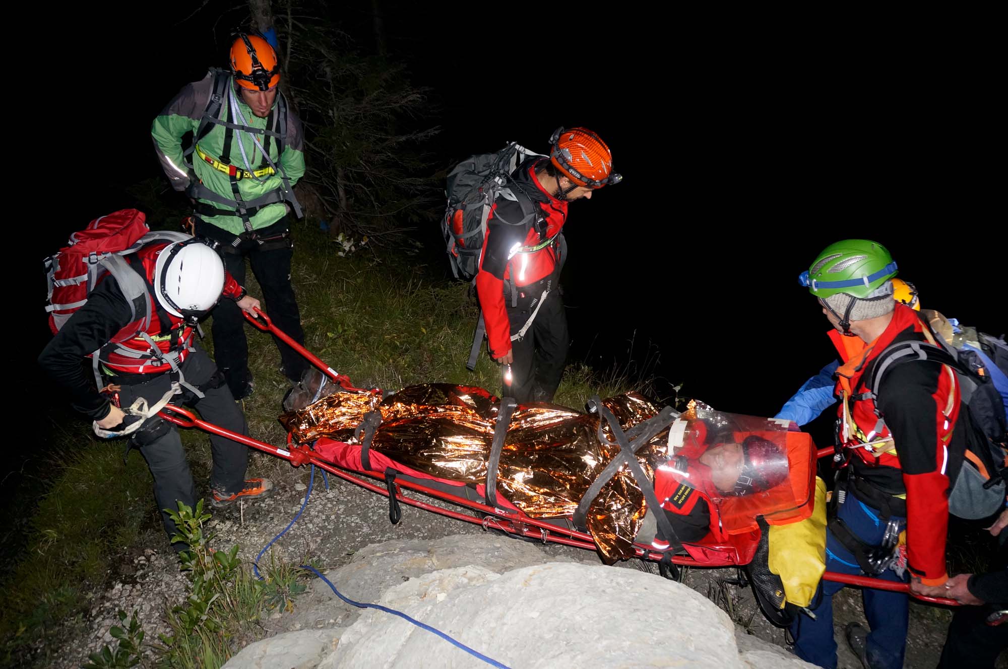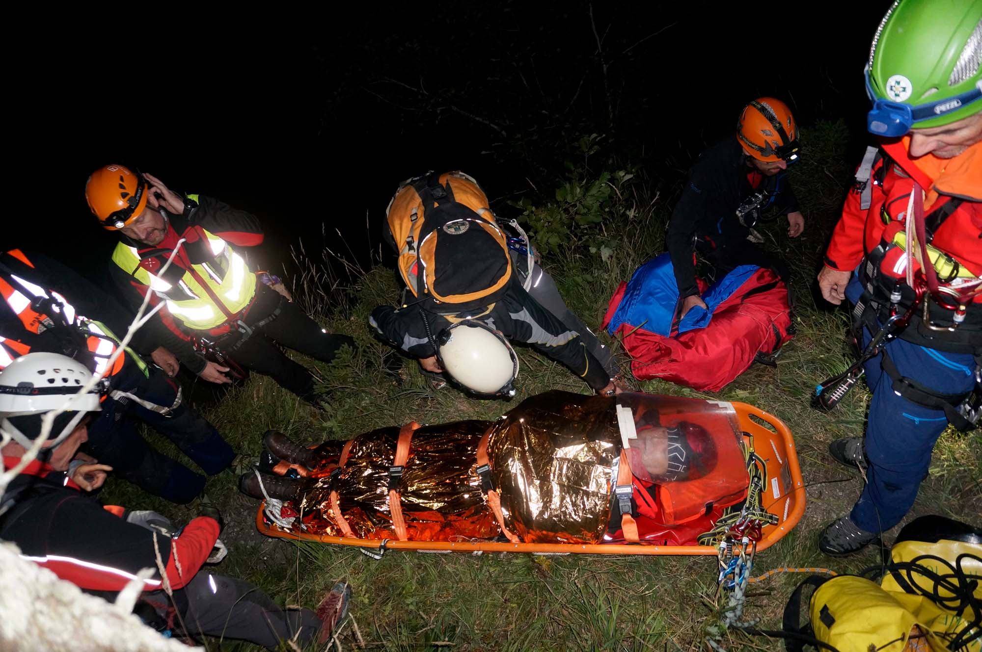 Wir bildeten 2 Teams, die unabhängig voneinander sich jeweils um einen Kletterer kümmerten. Für die Bergung des linken Verletzten richteten wir von ganz oben eine Abseilstelle ein. Wir haben ein Führungseil gespannt, an dem der Retter und der Bergesack mit dem Verletzten so von der Wand weggezogen werden konnte, dass die Bergung möglichst schohnend erfolgte. Der zweite Verletzte wurde mittels Schleifkorbtrage und einem Retter abgelassen.