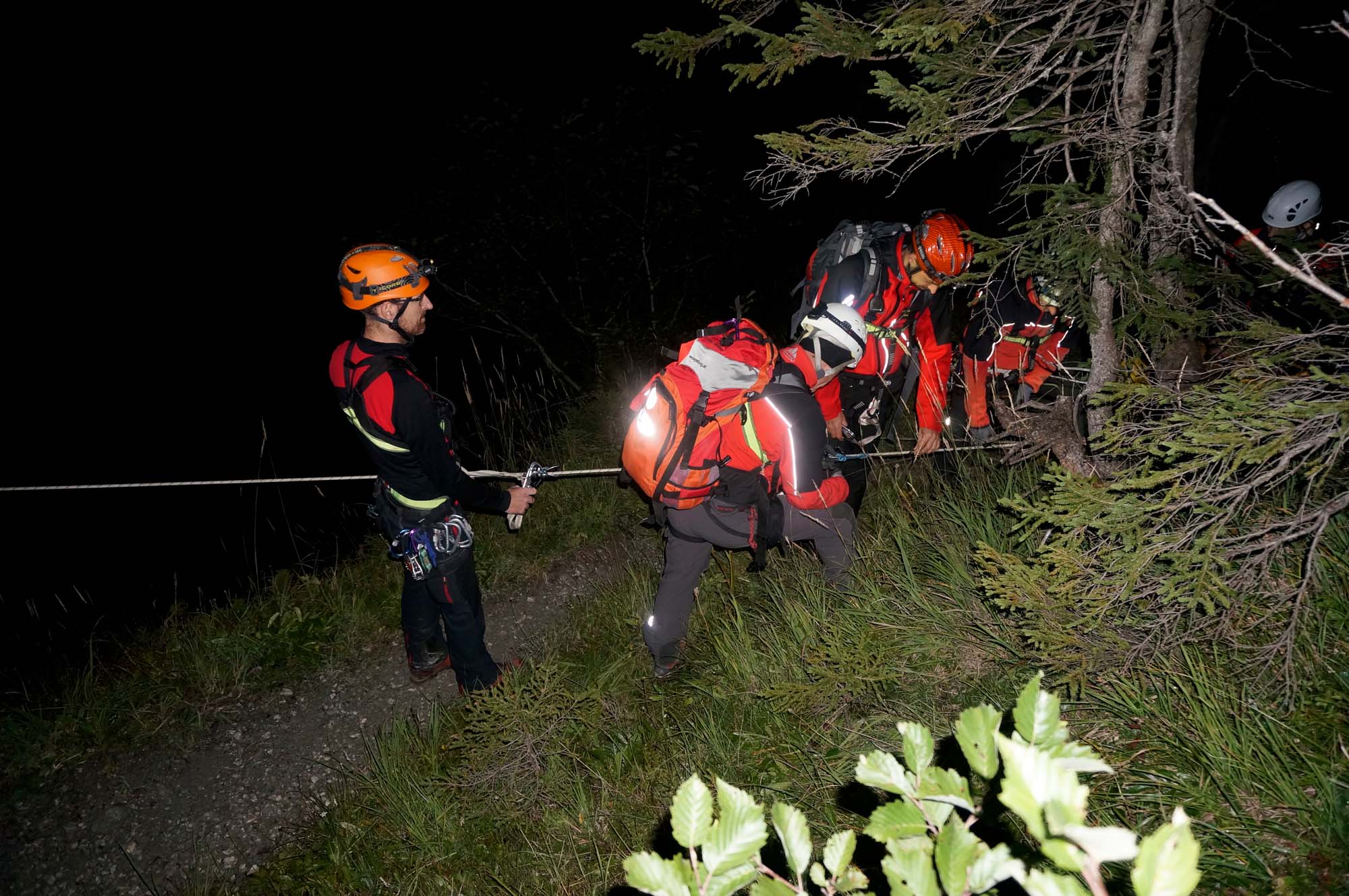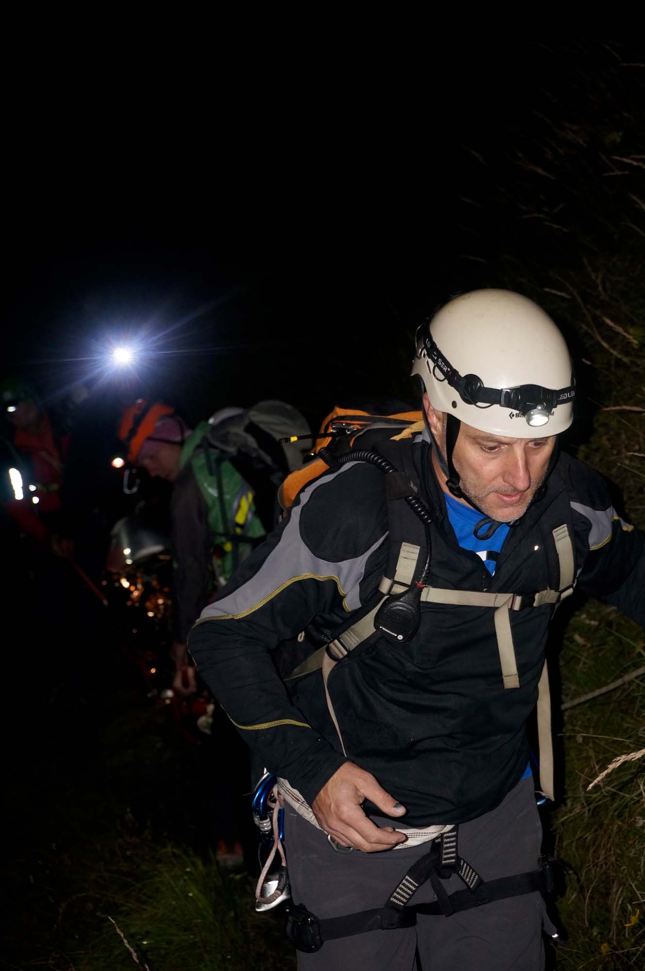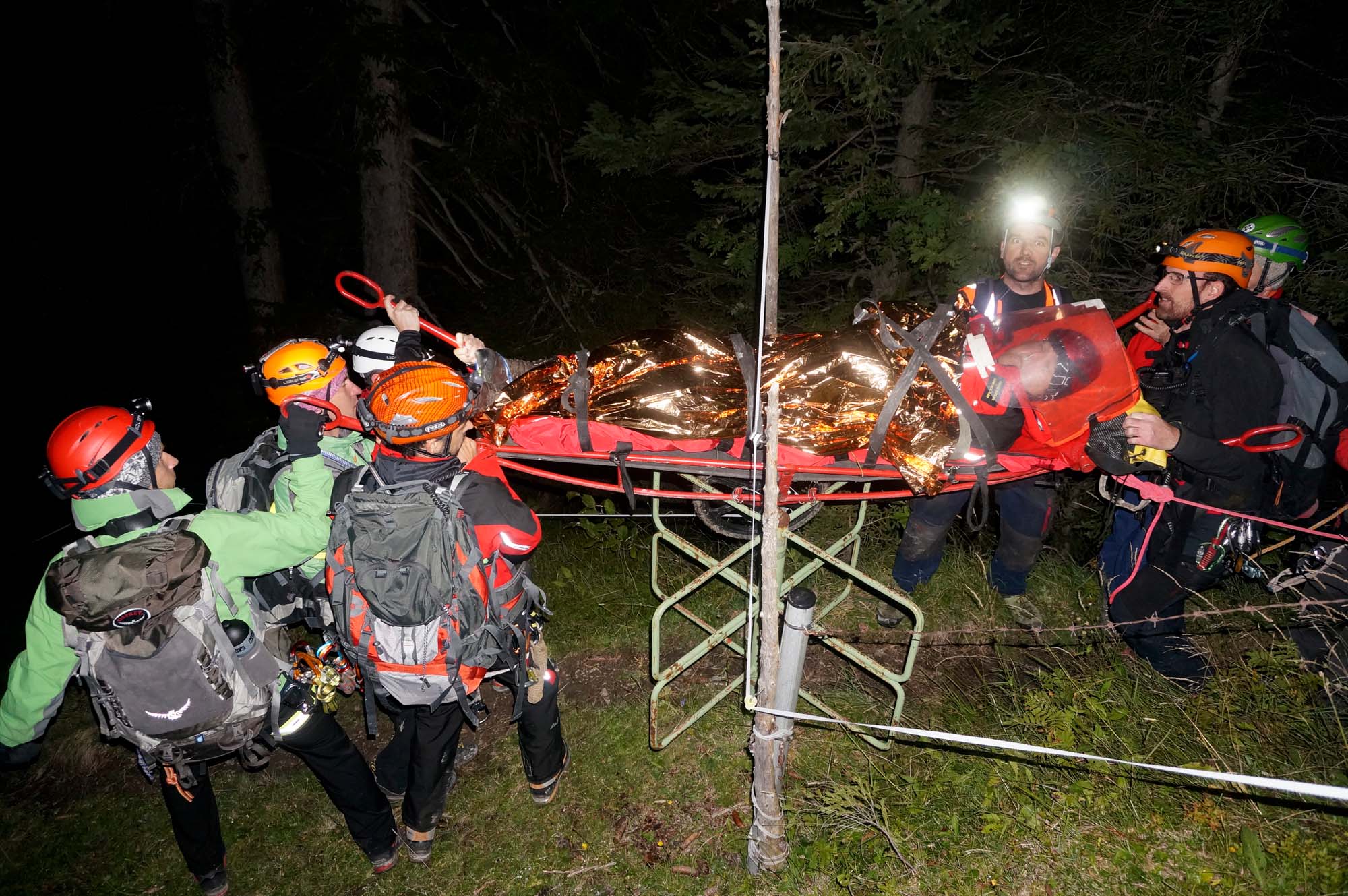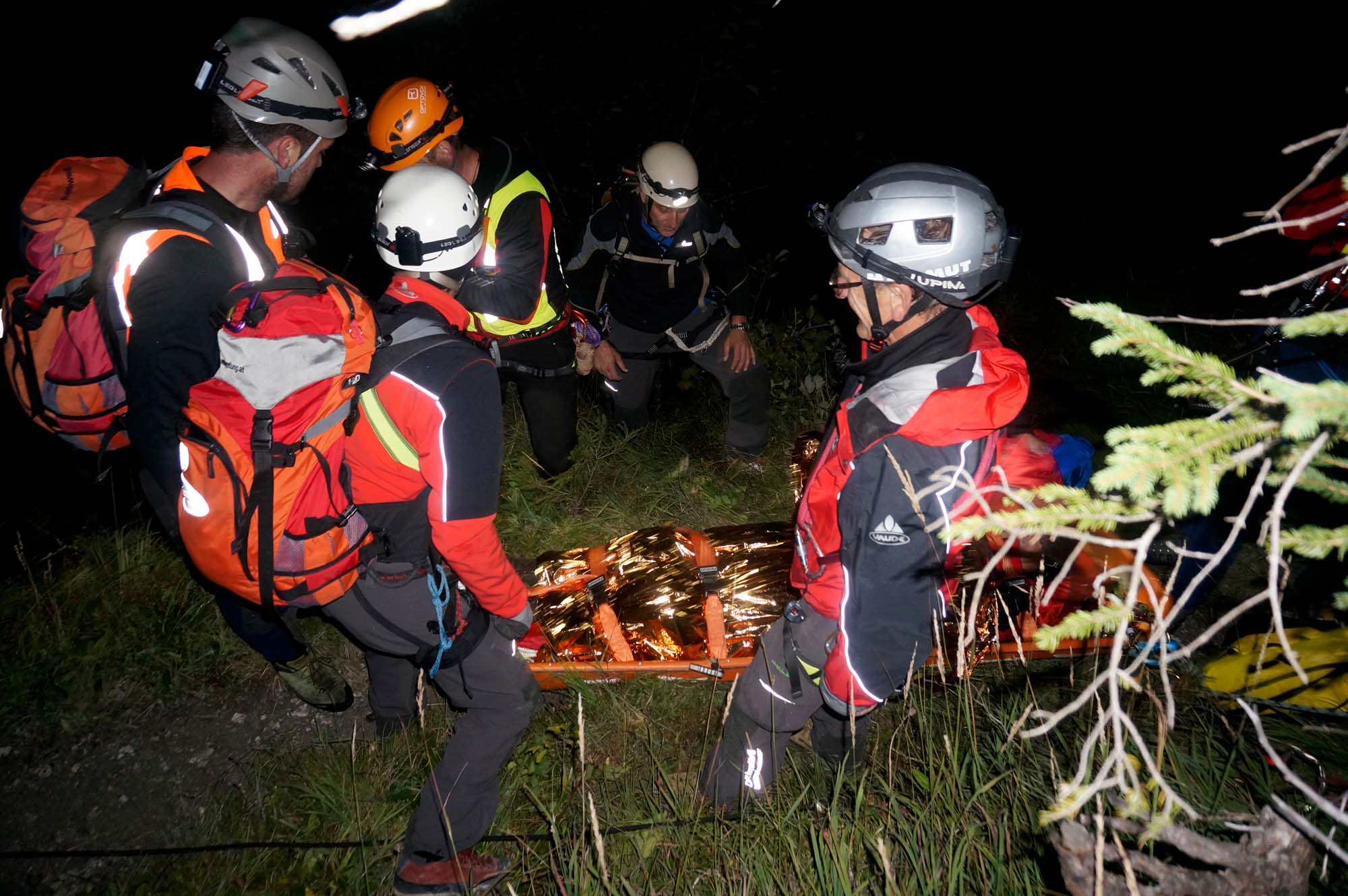Wir bildeten 2 Teams, die unabhängig voneinander sich jeweils um einen Kletterer kümmerten. Für die Bergung des linken Verletzten richteten wir von ganz oben eine Abseilstelle ein. Wir haben ein Führungseil gespannt, an dem der Retter und der Bergesack mit dem Verletzten so von der Wand weggezogen werden konnte, dass die Bergung möglichst schohnend erfolgte. Der zweite Verletzte wurde mittels Schleifkorbtrage und einem Retter abgelassen.
